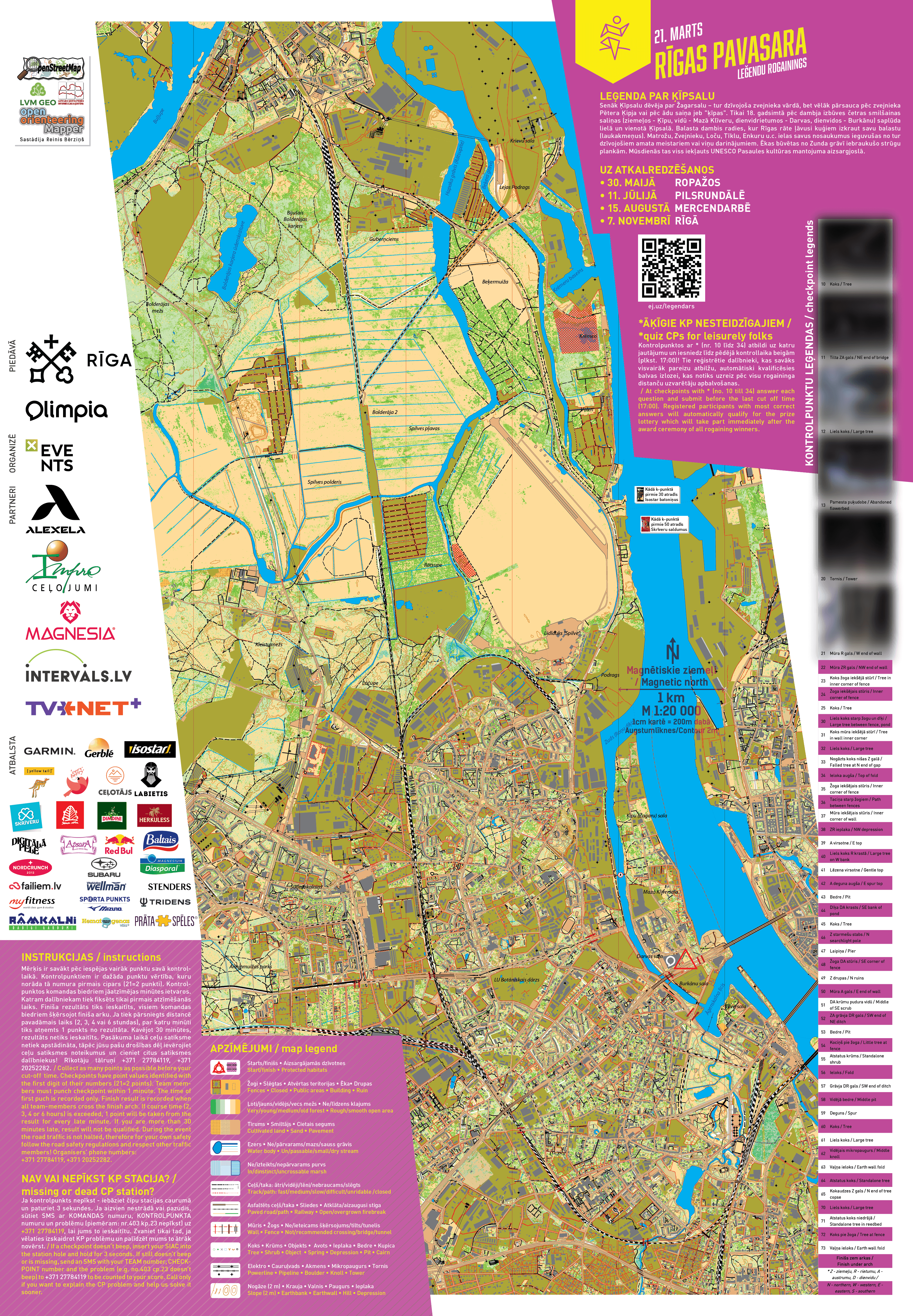 Iepazīsties ar kontrolpunktu leģendām jeb novietojuma aprakstiem! Lai gan jebkurā gadījumā jāmeklē objekts, kas atrodas aplīša centrā, tomēr leģendas paskaidro precīzāk, vai jāmeklē ēkas ziemeļu vai dienvidu pusē u.tml.. Dažas no kontrolpunktu vietām ir tik leģendāras, ka mums nācās tās nošifrēt, lai neatminētu pirms laika. Tomer Tu vari mēģināt tās atminēt kaut vai tagad. Pareizās atbildes uzzināsi sacensību dienā pirms starta, saņemot karti ar kontrolpunktiem. Leģendas lejuplādējamas arī XLSX tabulas formātā.