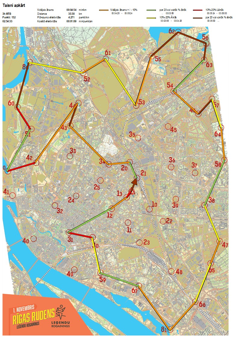 | Secības nr | KP nr | Laiks | Punkti | Kopējie punkti | Posma laiks | Kopējais laiks | Posma distance | Kopējā distance | min/km | min/pts | Vieta etapā |