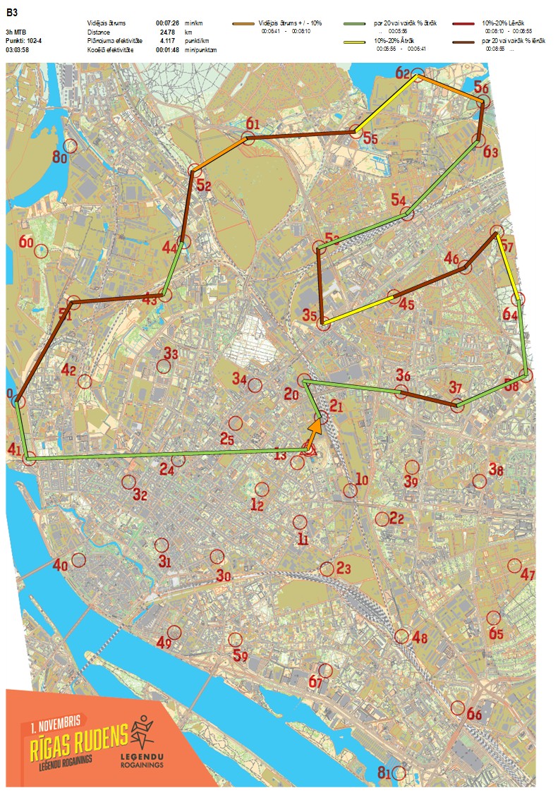 | Secības nr | KP nr | Laiks | Punkti | Kopējie punkti | Posma laiks | Kopējais laiks | Posma distance | Kopējā distance | min/km | min/pts | Vieta etapā |