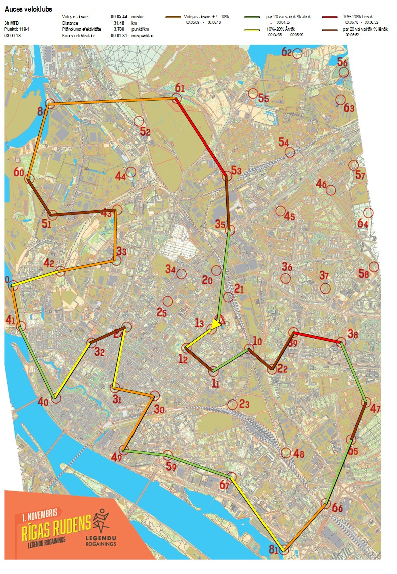 | Secības nr | KP nr | Laiks | Punkti | Kopējie punkti | Posma laiks | Kopējais laiks | Posma distance | Kopējā distance | min/km | min/pts | Vieta etapā |