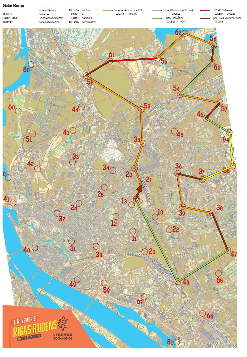 | Secības nr | KP nr | Laiks | Punkti | Kopējie punkti | Posma laiks | Kopējais laiks | Posma distance | Kopējā distance | min/km | min/pts | Vieta etapā |