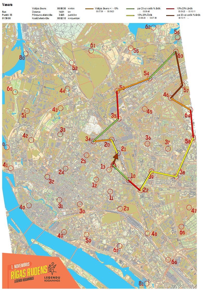 | Secības nr | KP nr | Laiks | Punkti | Kopējie punkti | Posma laiks | Kopējais laiks | Posma distance | Kopējā distance | min/km | min/pts | Vieta etapā |
