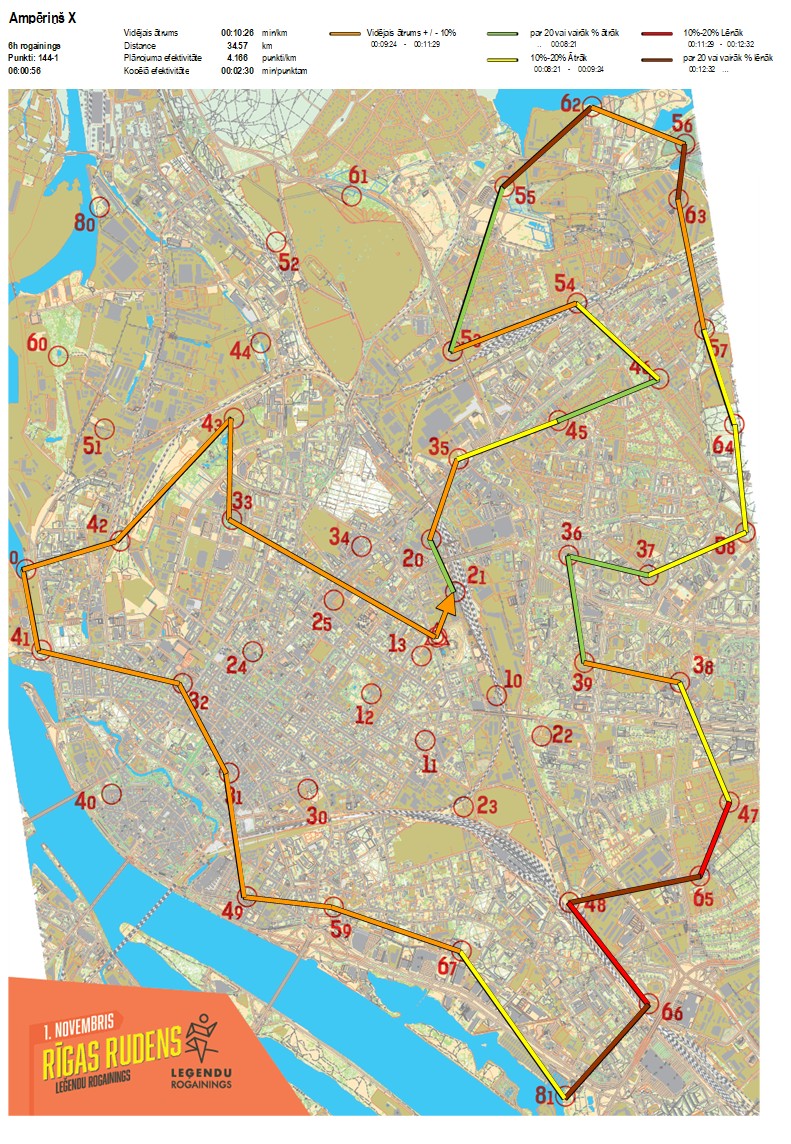 | Secības nr | KP nr | Laiks | Punkti | Kopējie punkti | Posma laiks | Kopējais laiks | Posma distance | Kopējā distance | min/km | min/pts | Vieta etapā |
