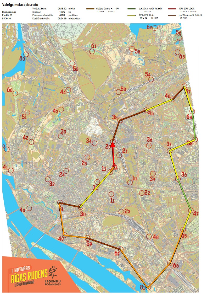 | Secības nr | KP nr | Laiks | Punkti | Kopējie punkti | Posma laiks | Kopējais laiks | Posma distance | Kopējā distance | min/km | min/pts | Vieta etapā |