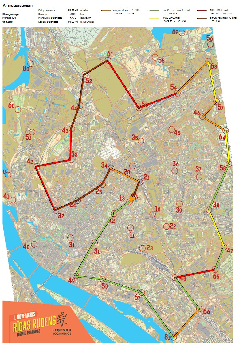 | Secības nr | KP nr | Laiks | Punkti | Kopējie punkti | Posma laiks | Kopējais laiks | Posma distance | Kopējā distance | min/km | min/pts | Vieta etapā |