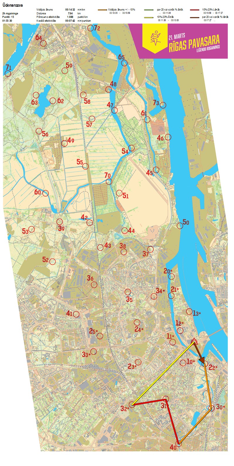 Secības nr KP nr Laiks Punkti Kopējie punkti Posma laiks Kopējais laiks Posma distance Kopējā distance min/km min/pts Vieta etapā
